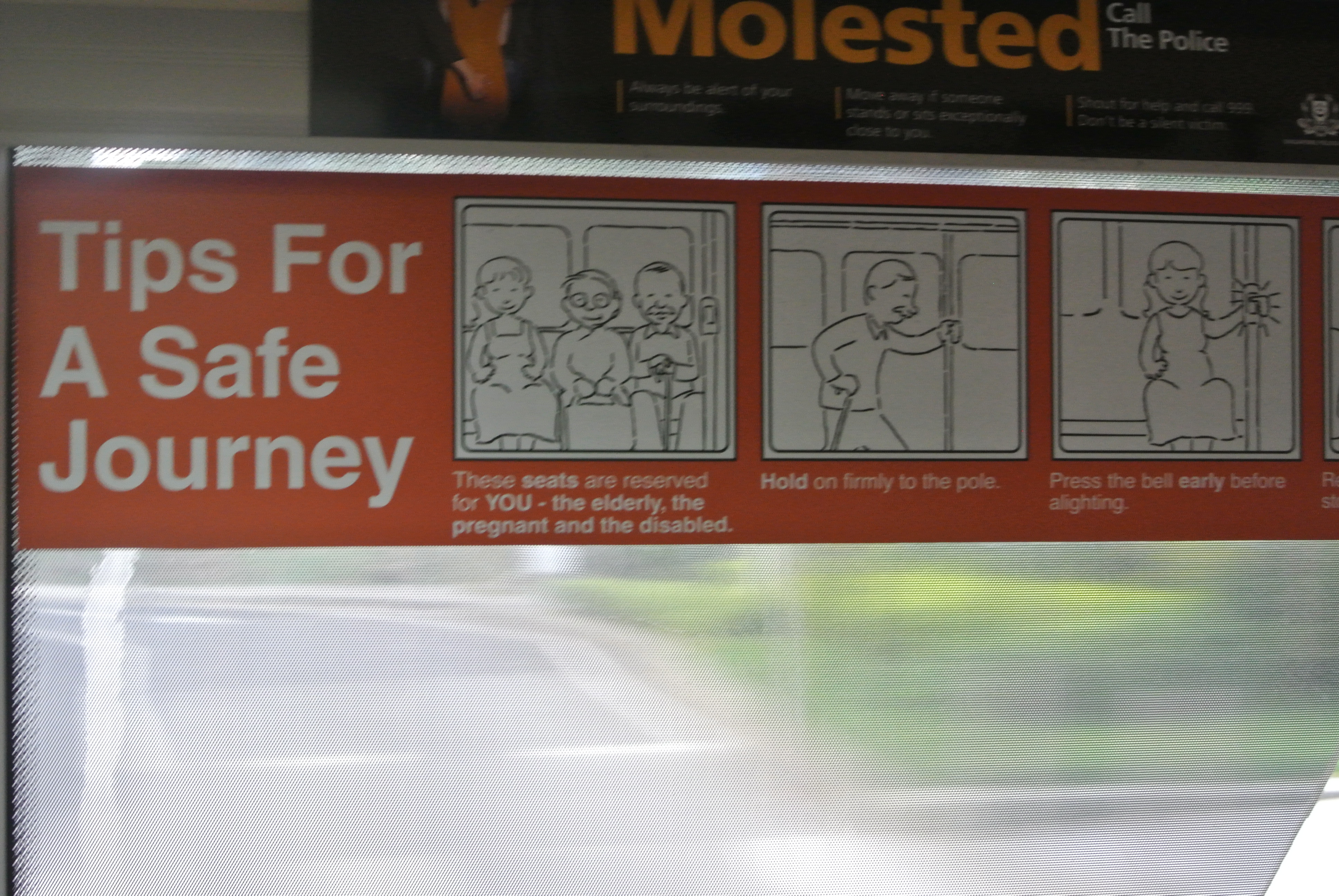 Do the right thing! Give up your seat to the elderly, injured people or pregnant ladies! The sign above it says if you are molested on the bus to call the police.